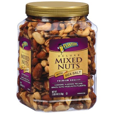 Planters deluxe mixed nuts with hazelnuts, 15.25 oz. Planters lightly salted deluxe mixed nuts, 10.3 oz canister 3. Pop open one of these cans of superior nut deluxe salted mixed nuts, 8 oz, 12 count and enjoy the rich, crunchy flavor of natural mixed nuts. Contains about 56 1 oz servings of planters peanuts. 160 calories per 1 oz.